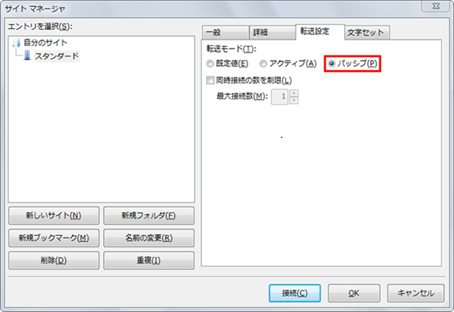 その場合は、FTPソフトの設定でパッシブモードで接続するよう設定を変更すると、問題が解決する場合があります。