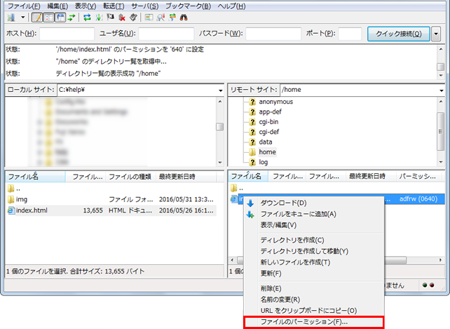 ファイルのパーミッションをの変更は以下の手順で行なってください。